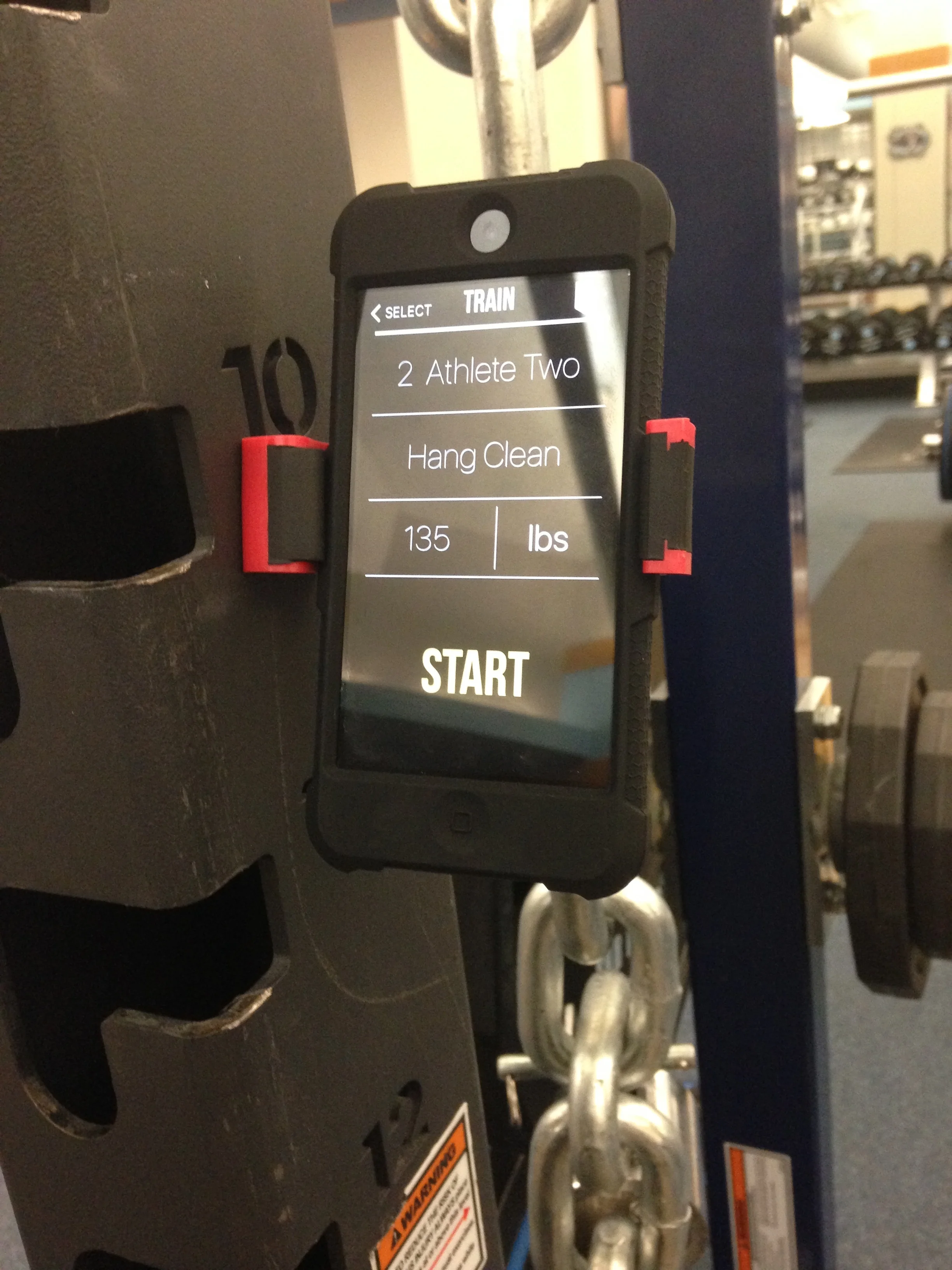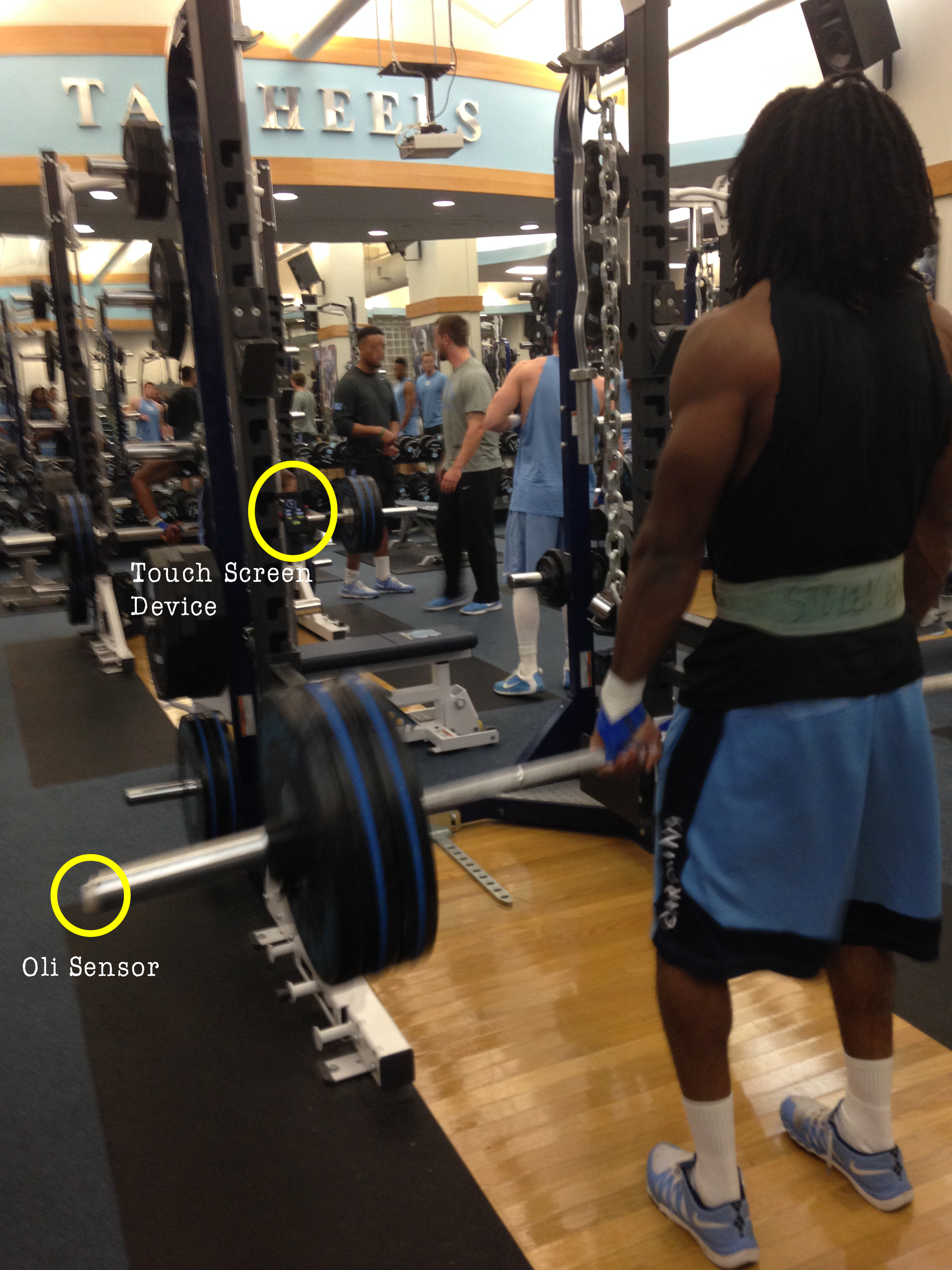 Worked to test our device with the University of North Carolina Football team. In the picture, on the barbell our beta device (circled) is attached to the end of the barbell allowing the athlete to have real time feedback on his lift. The information is displayed on the touch screen device (circled).